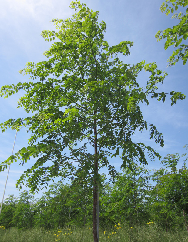 A fast growing oval-shaped tree with arching upright branches. The doubly compound leaves give the tree a lacey, tropical look in the summer which is in stark contrast to the rugged look this tree presents in the winter. This cultivar is seedless and has a finer texture with better branching habit than the species.