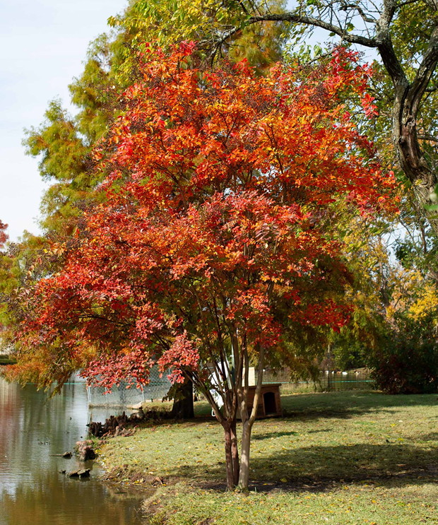 A great small tree for sunny places. It has clouds of showy white flowers in mid-late summer when not many other trees are blooming. The beautiful glossy green leaves turn a blazing orange-red in the fall. The peeling cinnamon colored bark rounds out this tree’s year long appeal.